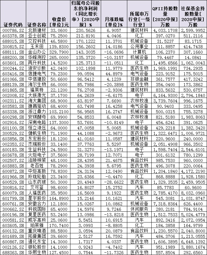 秉承長期投資、價值投資理念的社保基金持倉一直以來備受各方關注。在上述1110家凈利潤增長的公司中,截至今年上半年,包括順絡電子、湯臣倍健、利爾化學、廈門象嶼等在內的197家公司的前十大流通股股東名單中有社保基金現身。另外,有106公司的前十大流通股股東名單中有QFII現身。進一步梳理發現,有43家公司同時被社保基金和QFII持有,成為兩大機構共同追捧的對象。