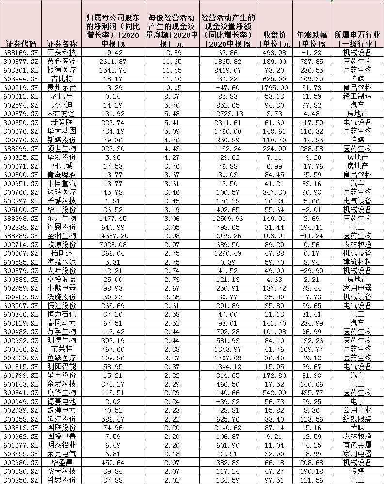 記者由此進一步梳理發現,在上半年凈利潤實現同比增長的公司中,TOP50公司(剔除銀行和非銀金融等行業的上市公司)的每股經營性活動現金流量凈額均在2元以上,彰顯出較好的發展“錢景”。其中,石頭科技、英科醫療、振德醫療、吉比特和貴州茅臺等5家公司,每股經營性動現金流量凈額均超10元,分別為12.89元、11.65元、11.45元、11.10元和10.05元。