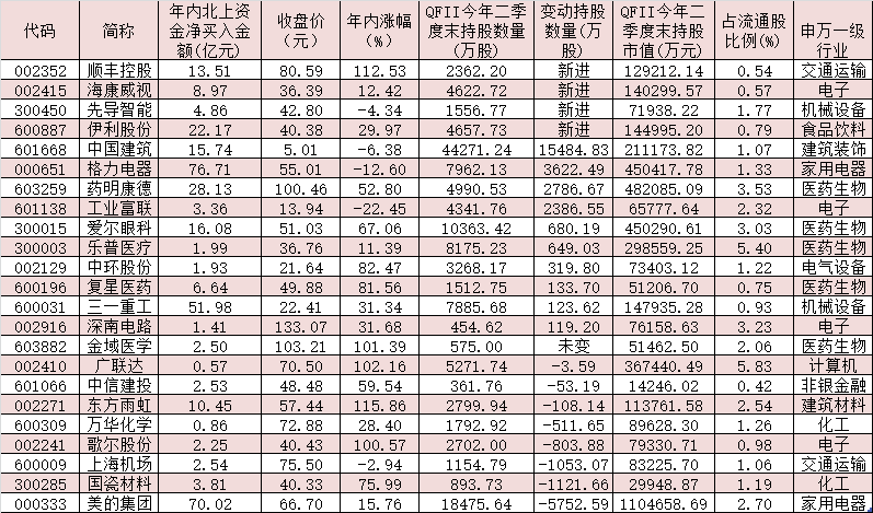 表:今年二季度獲QFII持倉(cāng)且今年以來受北上資金青睞的個(gè)股