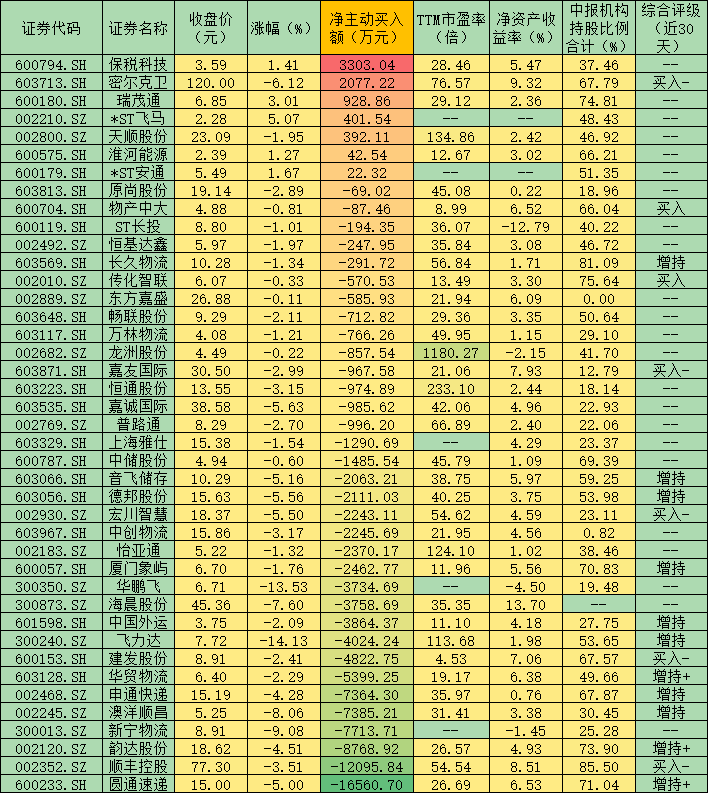 與業內理性分析師對行業向好判斷相一致的是,在周三板塊下跌過程中,有堅定看好的資金仍在積極買入部分物流股。據《證券日報》記者通過IFIND統計顯示,周三物流板塊整體凈主動買入額為-10.29億元,不過,有7只個股卻呈凈主動買入狀態,保稅科技(3303.04萬元)、密爾克衛(2077.22萬元)等兩只個股凈流入資金均超1000萬元。