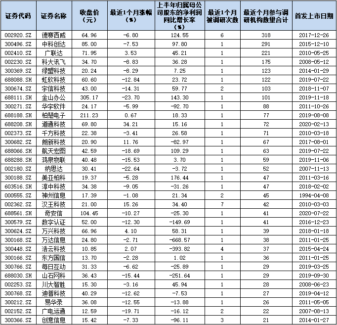 表:最近1個參與調研機構在20家以上的計算機公司一覽