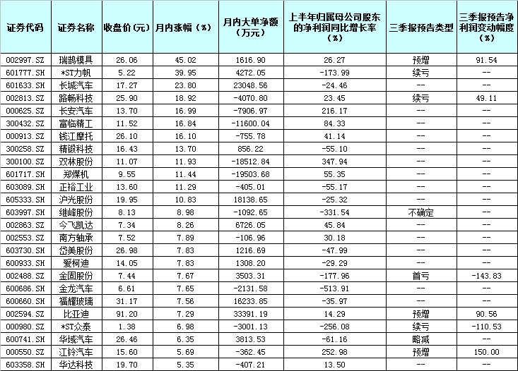 具體來看,45只汽車股月內股價實現不同程度的上漲。12只個股期間累計漲幅超10%,瑞鵠模具、長城汽車、路暢科技、長安汽車等個股均榜上有名。