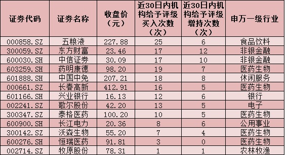 北上資金青睞的個股,不但受到各方的關注,同時也成為各大機構看好的主要對象。統計顯示,上述13只個股,近30日內,全部被機構給予“買入”或“增持”以上評級。其中,五糧液、東方財富、中信證券、藥明康德、中國中免、長春高新等6家公司被推薦次數均超過20次以上,后市值得關注。