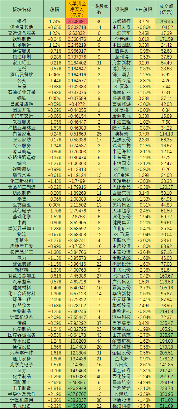 盤口方面,銀行股最為突出,不僅以1.74%漲幅居同花順各行業之首,資金凈流入同樣居首。《證券日報》記者通過同花順IFIND統計,周三交易中的36只銀行股合計大單資金凈買入額達25.08億元,居同花順各行業第一位。個股方面,包括工商銀行(49037.55萬元)、平安銀行(30828.14萬元)、招商銀行(21662.38萬元)等在內的9只銀行股周三大單資金凈買入均超1億元,此外,尚有17只銀行股大單資金凈買入均超1000萬元。