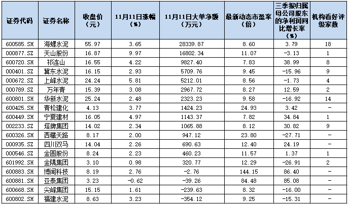 具體來看,11月11日,天山股份強勢漲停,上峰水泥、寧夏建材、祁連山等個股漲幅也均在4%以上,此外,青松建化、海螺水泥、福建水泥、萬年青等個股漲幅也均超3%。