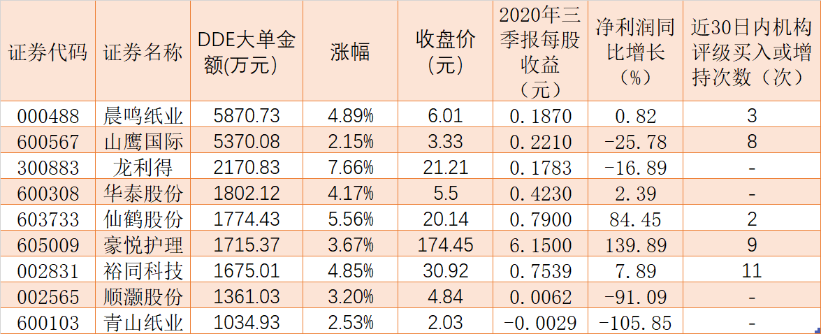 表:本周一大單資金凈流入超過千萬元的造紙股