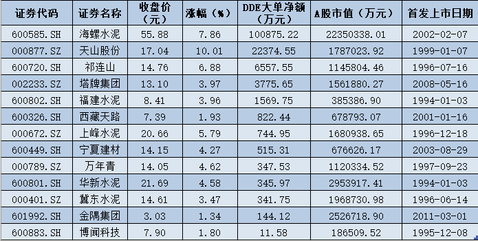 表:1月6日大單資金凈流入水泥股一覽