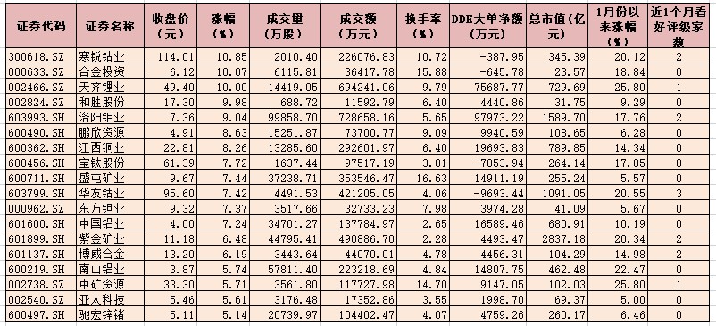 表:1月7日有色金屬行業漲幅超5%個股一覽