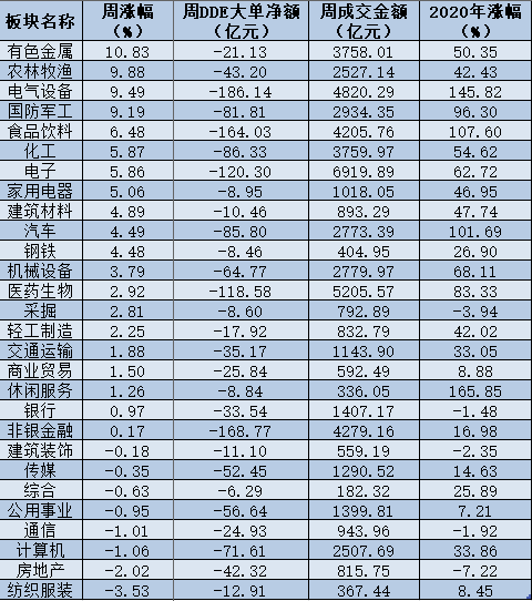 以申萬一級行業指數2021年首周漲幅排名來看,共有20個申萬一級行業指數實現不同程度的上漲,其中,期間累計漲幅前三名的行業分別為,有色金屬、農林牧漁、電氣設備,這三大行業期間累計漲幅均在9%以上。而紡織服裝則成為新年首周跌幅最大的行業,期間累計跌幅達到3.53%,此外,房地產、計算機和通信等行業期間累計跌幅也均在1%以上。