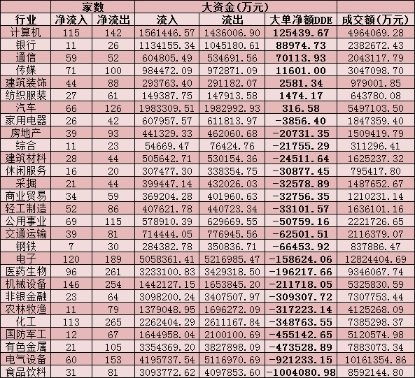 從資金層面看,今日A股大單資金整體凈流出447.36億元,其中,有1360只個股呈現資金凈流入,2722只個股呈現資金凈流出。從申萬一級的28個行業來看,有7個行業呈現大單資金凈流入態勢,其中,計算機、銀行、通信等三行業資金凈流入均超7億元,分別為12.54億元、8.9億元和7.01億元,合計達28.45億元,緊隨其后的是傳媒、建筑裝飾、紡織服裝、汽車等四行業。另外,食品飲料、電氣設備、有色金屬、國防軍工等行業資金凈流出均超40億元。