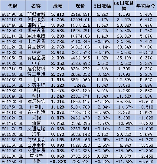 從行業來看,申萬一級28個行業多數飄紅。其中,非銀金融行業表現強勢,漲幅居首,達5.81%;緊隨其后的是休閑服務、國防軍工、機械設備、家用電器等四行業,漲幅均超3%,分別為4.7%、3.96%、3.53%和3.29%;僅有傳媒行業出現下跌,跌幅為0.32%。