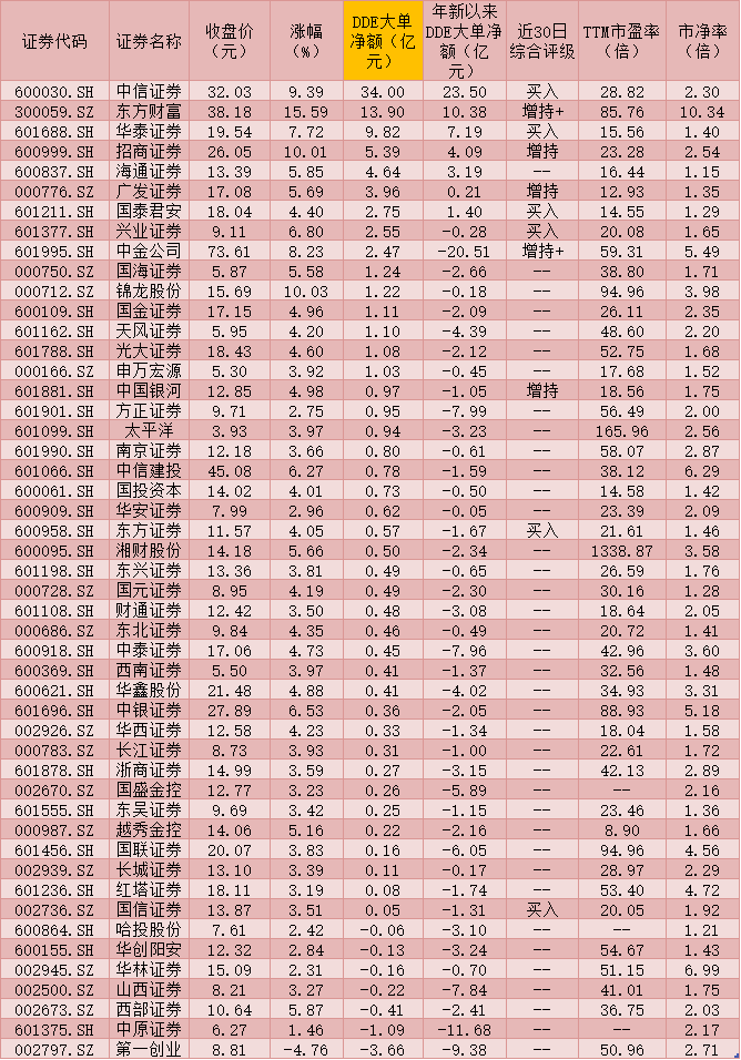 大單資金顯示出市場對券商股的熱情。據《證券日報》記者通過IFIND統計顯示,周二券商板塊有42只個股累計呈DDE大單主動凈流入態勢,其中,中信證券(34.00億元)、東方財富(13.90億元)、華泰證券(9.82億元)、招商證券(5.39億元)、海通證券(4.64億元)、廣發證券(3.96億元)、國泰君安(2.75億元)、興業證券(2.55億元)、中金公司(2.47億元)等9只個股DDE大單凈買入額均超2億元,合計79.49億元。