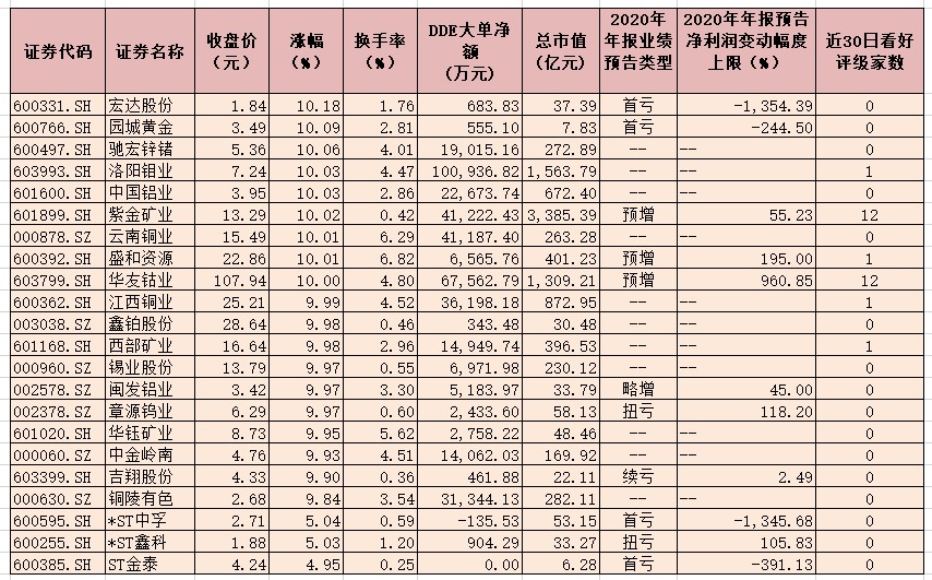 表:2月18日有色金屬行業(yè)22只漲停股一覽
