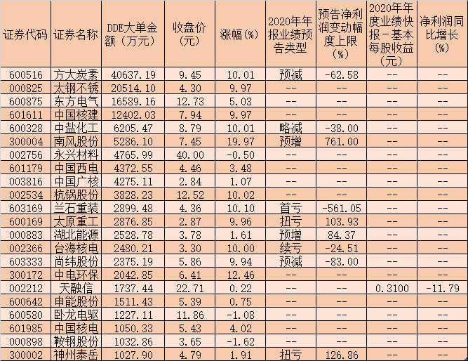 核電概念股獲得市場做多資金的積極搶籌,統計發現,3月8日,48只核電概念股呈現大單資金凈流入態勢,方大炭素、太鋼不銹、東方電氣、中國核建最受追捧,當日大單資金凈流入分別達到4.06億元、2.05億元、1.66億元和1.24億元,中鹽化工、南風股份、永興材料、中國西電、中國廣核等5只概念股大單資金凈流入也均超4000萬元,包括杭鍋股份、蘭石重裝、太原重工、湖北能源等在內的13只概念股當日也均受到千萬元以上大單資金搶籌,這22只概念股合計吸金14.17億元,后市表現值得期待。