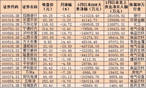 從滬股通、深股通前十大成交活躍股來看,3月以來,共有32只個股現身前十大成交活躍股榜單,17只活躍股處于期間凈買入狀態,北上資金合計凈買入140.93億元。其中,招商銀行、中國平安、萬華化學、寧德時代、瀘州老窖等5只個股,期間北上資金凈買入額居前均超10億元,分別為28.1億元、23.57億元、12.66億元、12.64億元和11.33億元。