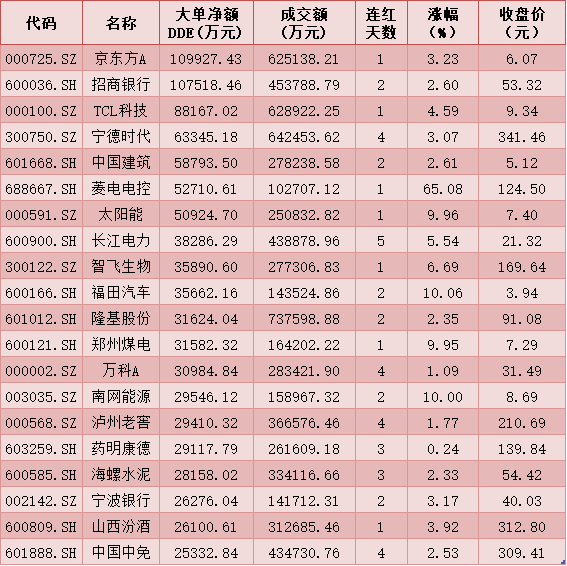 一、周五(3月12日)DDE大單資金凈買入TOP20