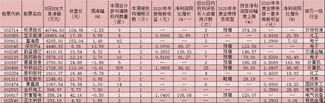 值得一提的是,近期市場做多資金紛紛涌入機構調研的年報業績穩定增長品種進行加倉。統計顯示,上述45只年報業績實現或有望實現同比增長的個股中,有14只績優股本周呈現大單資金凈流入態勢,合計吸金9.78億元。牧原股份、寶豐能源最受追捧,期間累計大單資金凈流入分別達到4.07億元、2.85億元,富瀚微、深紡織A、蔚藍鋰芯、拓邦股份、賽意信息、中科創達、泰和新材、駱駝股份、景嘉微等9只績優股期間均受到千萬元以上大單資金青睞,金杯電工、安靠智電、亞太科技等3只績優股期間備受大單資金的關注,后市表現值得期待。