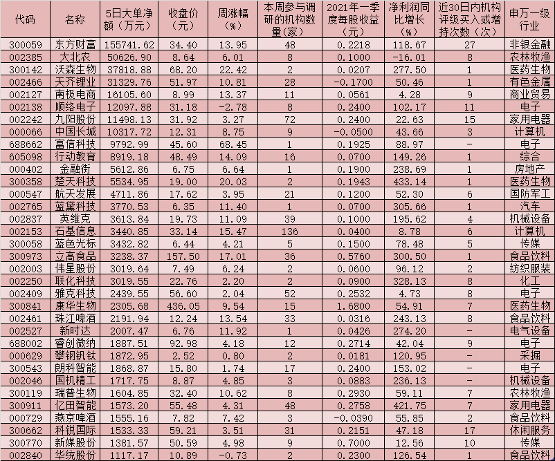 在上述本周被機構調研的174家公司中,157家公司2021年一季度實現凈利潤同比增長,占比逾九成。其中,有84家公司報告期內實現凈利潤同比翻番,華鵬飛、盛和資源、中泰化學、萬潤科技、雅化集團、三泰控股、美錦能源等7家公司報告期內實現凈利潤同比增長10倍以上。