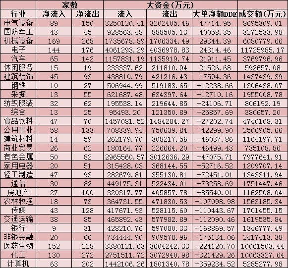從資金層面看,A股大單資金整體凈流出194.4億元,其中,有1421只個股呈現(xiàn)資金凈流入,有2863只個股呈現(xiàn)資金凈流出。從申萬一級的28個行業(yè)來看,僅有7個行業(yè)呈現(xiàn)資金凈流入態(tài)勢。其中,電氣設(shè)備和國防軍工等兩個行業(yè)資金凈流入均超4億元,分別為4.77億元和4.01億元。另外,21個行業(yè)呈現(xiàn)資金凈流出態(tài)勢,其中,計算機、化工、醫(yī)藥生物等三行業(yè),資金凈流出均超20億元。
