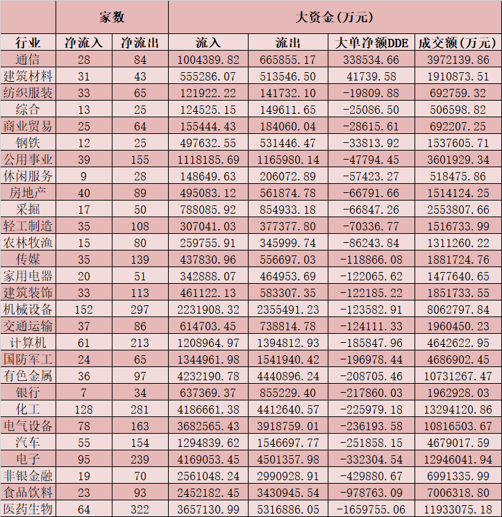 從資金層面看,周五,A股大單資金整體凈流出565.63億元。其中,有1152只個股呈現資金凈流入,有3209只個股呈現資金凈流出。從申萬一級的28個行業來看,僅有通信和建筑材料等兩個行業呈現大單資金凈流入,分別為33.85億元和4.17億元。另外,26個行業均呈現資金凈流出態勢,其中,醫藥生物和食品飲料等行業,大單資金凈流出均超90億元。