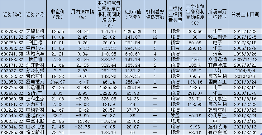 值得一提的是,上述業績預喜公司中,有10家公司最近1個月內獲機構給予“買入”或“增持”等看好評級,其中,天賜材料、勁嘉股份等兩只個股機構看好評級家數均在10家以上,分別為15家、12家,此外,利亞德、中泰化學、華域汽車、楚江新材、怡亞通等個股也均獲2家及以上機構扎堆推薦。