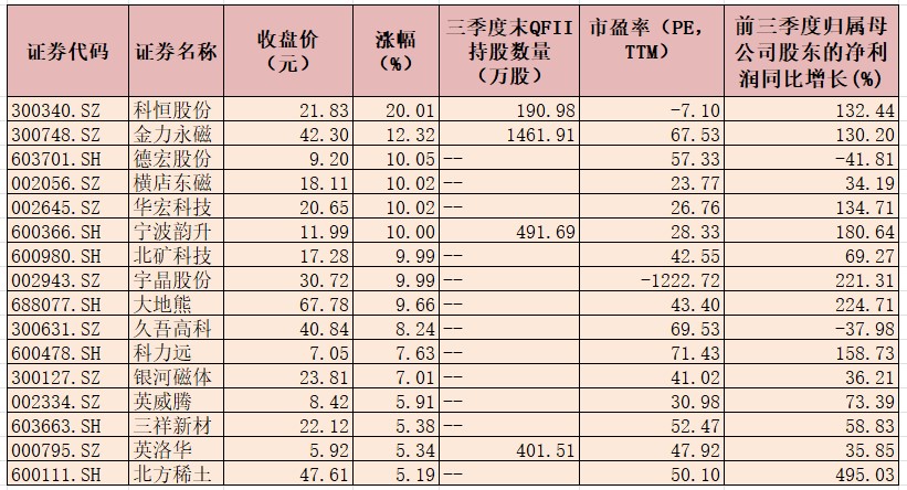 表:11月17日稀土永磁板塊漲幅超5%的個股一覽