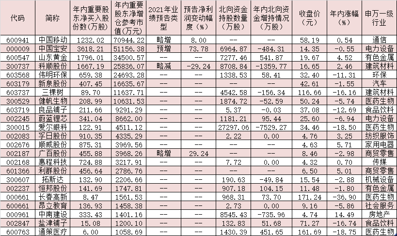統計發現,在上述今年以來獲重要股東凈增持的51公司中,37家公司2021年前三季度實現凈利潤同比增長,占比逾七成。截至目前,8家公司已披露了2021年業績預告,多氟多、中國寶安、起帆電纜、德業股份、南風化工、廣百股份、中國移動等7家公司業績預喜。