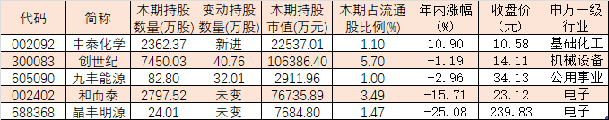 從持倉變化來看,上述社保基金持倉的5只個股中,去年四季度社保基金新進持有中泰化學2362.37萬股,社保基金對創世紀、九豐能源等2只個股進行加倉操作,社保基金增持數量分別為40.76萬股、32.01萬股。此外,和而泰、晶豐明源等2只個股本期社保基金持股數量未變,持股數量分別為2797.52萬股、24.01萬股。