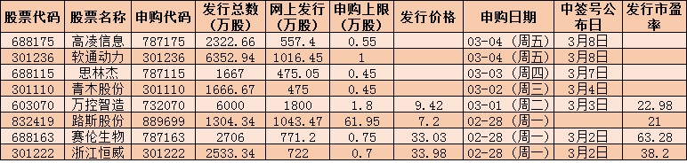 表:下周(2月28日-3月4日)8只新股申購情況: