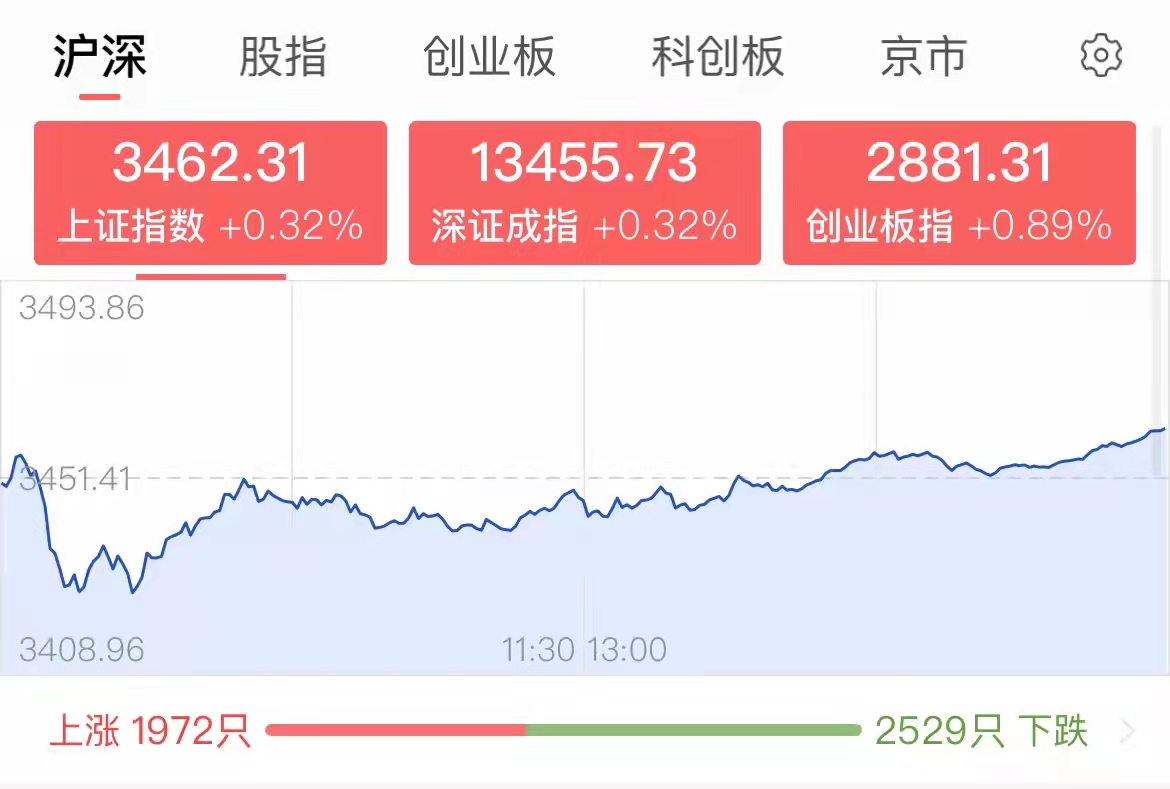 周一,A股三大指數探底回升,集體收漲,截至收盤,上證指數漲0.32%,報3462.31點;深證成指漲0.32%,報13455.73點;創業板指漲0.89%,報2881.31點;滬深兩市合計成交額9491億元;北向資金凈買入20.47億元;總體來看,兩市個股跌多漲少。