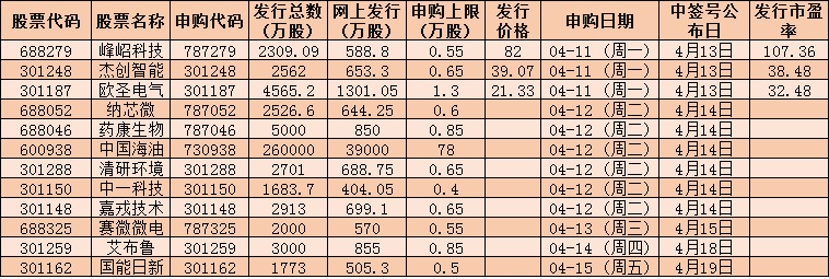 4月11日,冠龍節能將在創業板登陸。下周(4月11日-15日)將有12只新股發行,累計發行數量約33億股,預計募集資金75.92億元。其中,4月11日發行的是峰岹科技、杰創智能、歐圣電氣,4月12日發行的是納芯微、藥康生物、中國海油、清研環境、中一科技、嘉戎技術,4月13日發行的是賽微微電,4月14日發行的是艾布魯,4月15日發行的是國能日新。