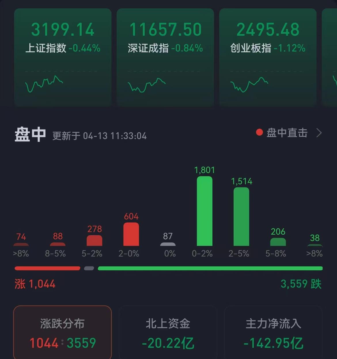 4月13日,A股三大指數震蕩回落。截至11:30,上證指數跌幅達0.44%,報3199.14點;深證成指和創業板指跌幅分別為0.84%和1.12%;滬深兩市合計成交額5376.3億元;總體來看,兩市個股跌多漲少。