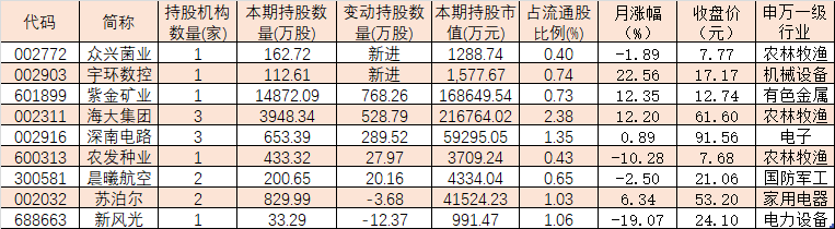 與2021年四季度末相比,QFII新進增持7只個股,今年一季度QFII新進持有眾興菌業(yè)、宇環(huán)數(shù)控等2只個股,QFII持股數(shù)量分別為162.72萬股、112.61萬股。另外,紫金礦業(yè)、海大集團、深南電路、農(nóng)發(fā)種業(yè)、晨曦航空等5只個股今年一季度贏得QFII繼續(xù)加倉。