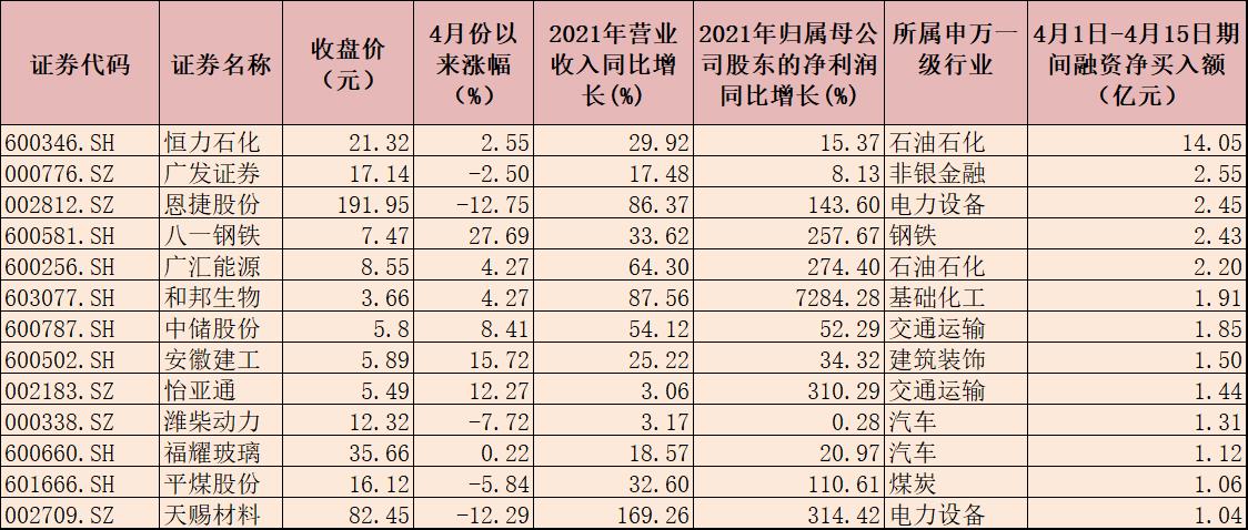 部分績優股也獲得融資客的青睞。4月份以來截至4月15日,上述1265只績優股中有229只期間獲得融資客加倉,合計凈買入額為72.62億元,其中,恒力石化期間獲融資客加倉額位居首位,為14.05億元,廣發證券、恩捷股份、八一鋼鐵、廣匯能源等4只個股期間獲融資客凈買入額均超2億元。