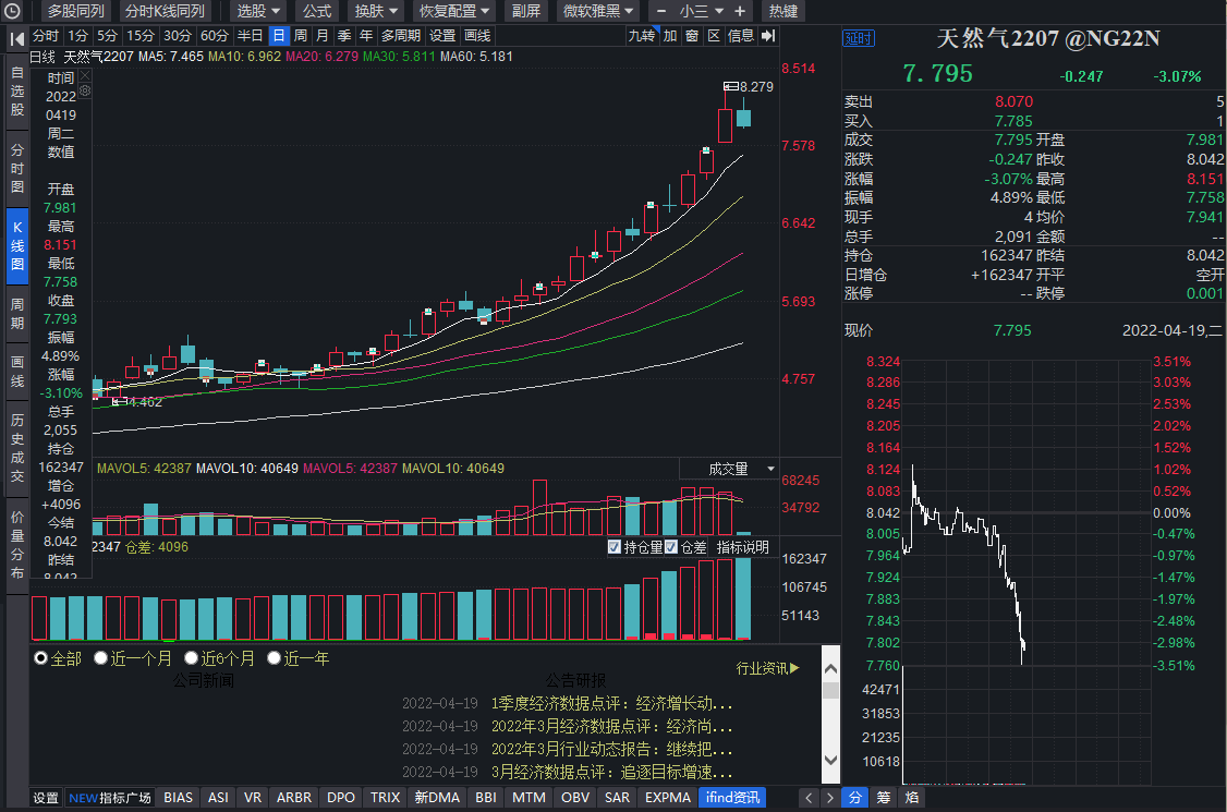 近期,美國天然氣期貨價格持續上漲。同花順數據顯示,上周以來,截至北京時間4月19日5:00,7月份交貨的NYMEX天然氣期貨收盤于7.994美元/百萬英熱,期間累計上漲23.67%;而年初以來,NYMEX天然氣期貨合約價格期間累計上漲117.29%,價格實現翻番。
