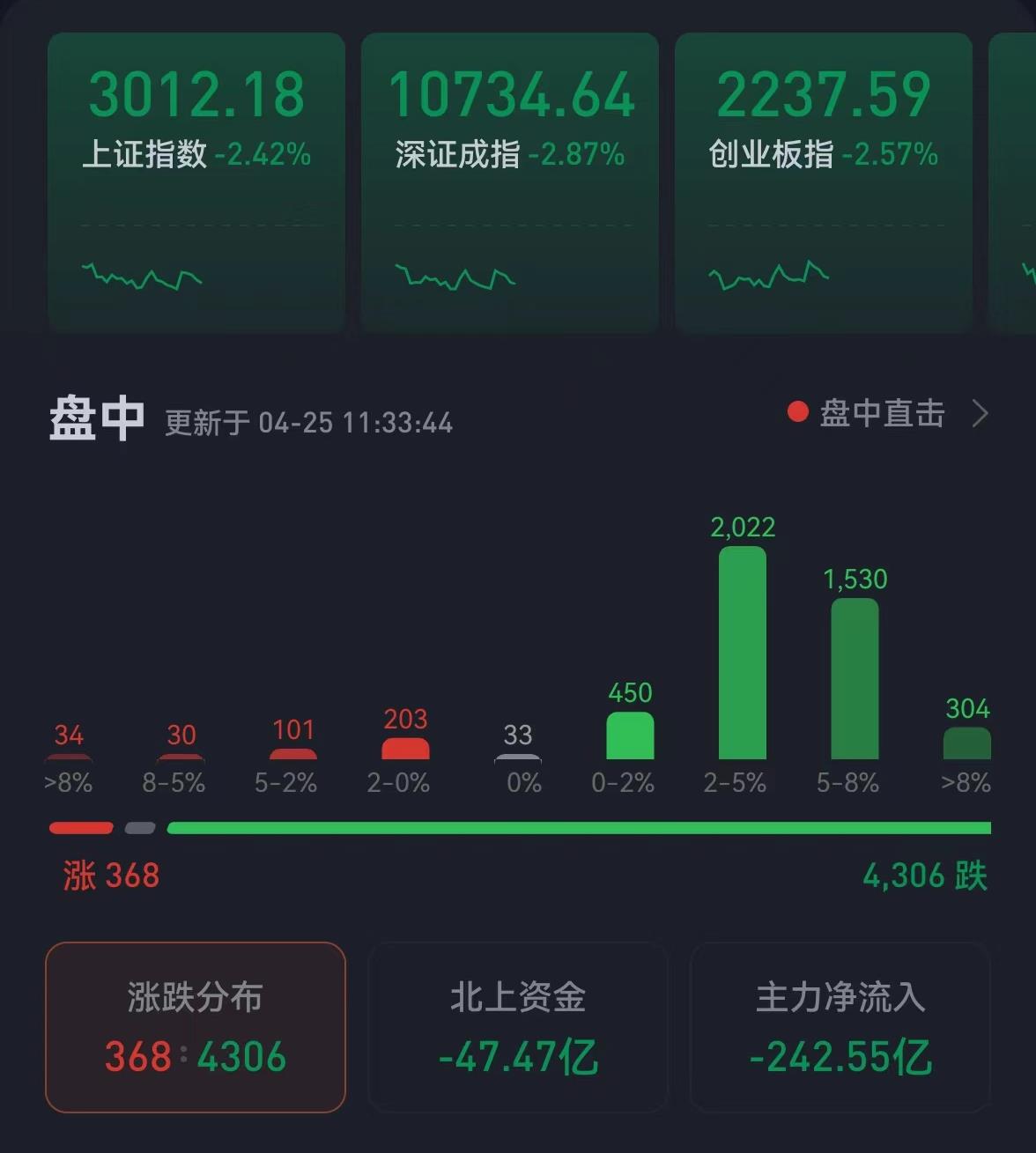 4月25日,A股繼續(xù)震蕩回落。截至上午收盤,三大指數(shù)跌幅均超2%,上證指數(shù)跌幅達(dá)2.42%,報(bào)3012.18點(diǎn),逼近3000點(diǎn)整數(shù)關(guān)口;深證成指和創(chuàng)業(yè)板指跌幅分別為2.87%和2.57%;滬深兩市合計(jì)成交額5110.4億元;總體來看,兩市個(gè)股漲少跌多,上漲個(gè)股368只,下跌個(gè)股達(dá)4306只。