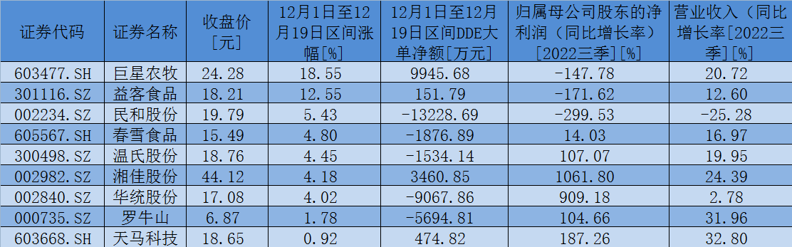 表:12月1日至12月19日,養雞概念板塊期間實現上漲個股一覽