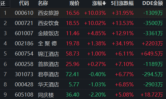 從早盤表現(xiàn)強(qiáng)勢(shì)的酒店及餐飲行業(yè)看,交易中的9只成份股有6只上漲,其中2只漲幅超5%。