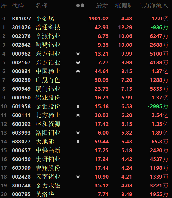 從早盤表現(xiàn)強(qiáng)勢(shì)的小金屬行業(yè)看,交易中的38只成份股有35只上漲,其中章源鎢業(yè)、翔鷺鎢業(yè)、東方鉭業(yè)和東方鋯業(yè)封漲停板,另有11只個(gè)股漲超5%。資金流向看,小金屬行業(yè)大單資金凈流入額為12.9億元,居行業(yè)第1位。