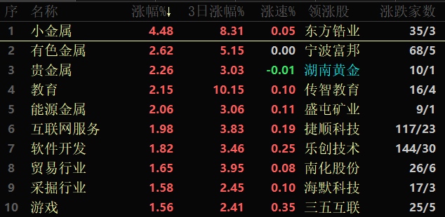 東方財(cái)富行業(yè)方面,截至2月1日11:30,86類行業(yè)中75類上漲,占比87.21%,其中,小金屬行業(yè)漲幅居首,達(dá)4.48%,此外,有色金屬、貴金屬和教育等行業(yè)漲幅也超過2%。下跌方面,航空機(jī)場(chǎng)行業(yè)跌幅居首,達(dá)1.11%。