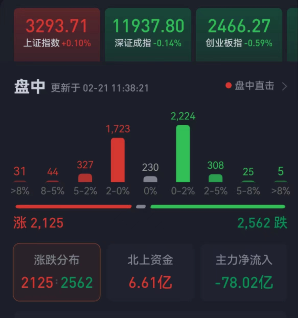 周二(2月21日),A股三大股指震蕩分化,漲跌不一。截至上午收盤,上證指數漲幅達0.10%,報3293.71點;深證成指和創業板指跌幅分別為0.14%和0.59%;滬深兩市合計成交額6232.5億元,總體來看,兩市個股跌多漲少。其中,漲停個股達21只,跌停個股達1只。