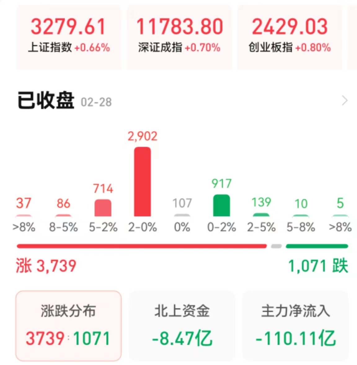 周二(2月28日),A股三大指數震蕩上行,全線飄紅。截至收盤,上證指數漲0.66%報3279.61點,深證成指漲0.70%報11783.8點,創業板指漲0.80%報2429.03點;兩市合計成交金額達7567億元,北向資金凈賣出13.04億元。總體上看,兩市個股漲多跌少。其中,漲停個股達33只,跌停個股2只。
