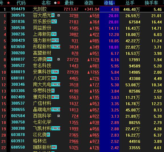 對于該板塊的投資機會,浙商證券分析認為,光刻膠是半導體光刻工藝的核心原材料,其產品水平直接影響芯片制造水平,按曝光波長由大到小可分為G/I線膠、KrF膠、ArF膠和EUV膠。隨著芯片集成度的提高,適用于8寸、12寸半導體硅片的配KrF、ArF是當下及未來短期內各光刻膠公司的重點發力市場。目前國內半導體光刻膠需求90%依賴從日本、美國進口,國內廠商徐州博康、北京科華、蘇州瑞紅、南大光電、上海新陽等在半導體高端光刻膠研發和量產上實現突破,光刻膠國產化是大勢所趨,隨著關鍵原材料國產化進程提速,國內廠商有望實現份額提升。