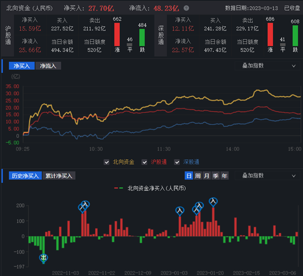 3月13日,滬深兩市三大指數(shù)震蕩分化,滬指表現(xiàn)相對強勢,K線呈長陽吞陰形態(tài)。截至收盤,上證指數(shù)漲1.20%報3268.70點;深證成指漲0.55%報11505.02點,創(chuàng)業(yè)板指跌0.56%報2357.07點,A股合計成交額8396.88億元,較前一交易日縮減3.67%,北向資金凈買入27.70億元,滬股通凈買入15.59億元,深股通凈買入12.11億元。總體上看,A股中上漲個股數(shù)量略少,有2342只上漲,2583只下跌。