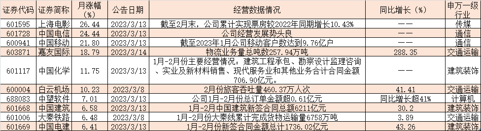 表:已披露2023年前兩個月經營數據向好且月內漲幅超5%的個股