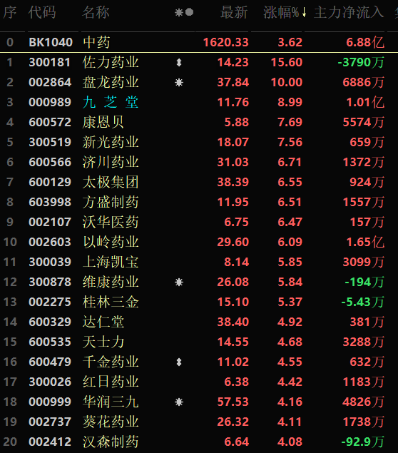 從早盤表現強勢的中藥行業看,該行業交易中的73只成份股中有71只上漲,其中,有13只個股漲幅超5%。資金方面,有6.88億元大單資金凈流入該行業,居各行業板塊第2位。
