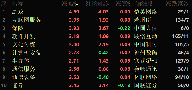 東方財富行業方面,截至3月17日11:30,86個行業板塊中76類上漲,占比88.37%,其中,游戲行業漲幅居首,達4.59%,另有包括互聯網服務、保險、軟件開發和文化傳媒等行業漲幅均超3%。下跌方面,中藥跌幅居首,達0.85%。