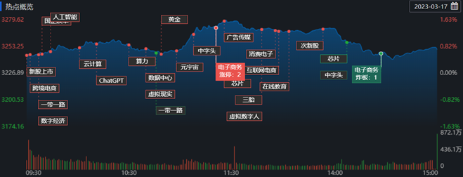 3月17日,滬深兩市三大指數震蕩分化,滬指日K線走出長上影的仙人指路形態,深證成指則連續兩天收盤處于半年線之下。截至收盤,上證指數漲0.73%報3250.55點;深證成指漲0.36%報11278.05點,創業板指跌0.36%報2293.67點,A股合計成交額9734.32億元,較前一交易日增長15.14%,北向資金凈買入71.83億元,滬股通凈買入11.45億元,深股通凈買入60.37億元。總體上看,A股中漲多跌少,有3220只上漲,1696只下跌。