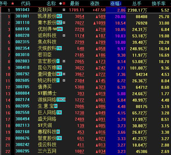 具體看,截至3月21日上午收盤,互聯網板塊漲幅居首達2.86%。其中,凱淳股份20CM漲停。
