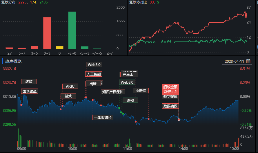 4月11日,A股三大指數(shù)尾盤拉升漲跌互現(xiàn),滬指3300點失而復(fù)得,A股成交金額連續(xù)6個交易日超萬億元。傳媒板塊領(lǐng)漲,多只傳媒股漲停。